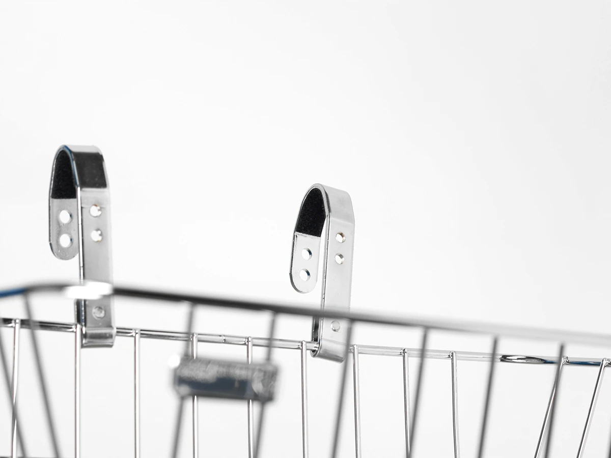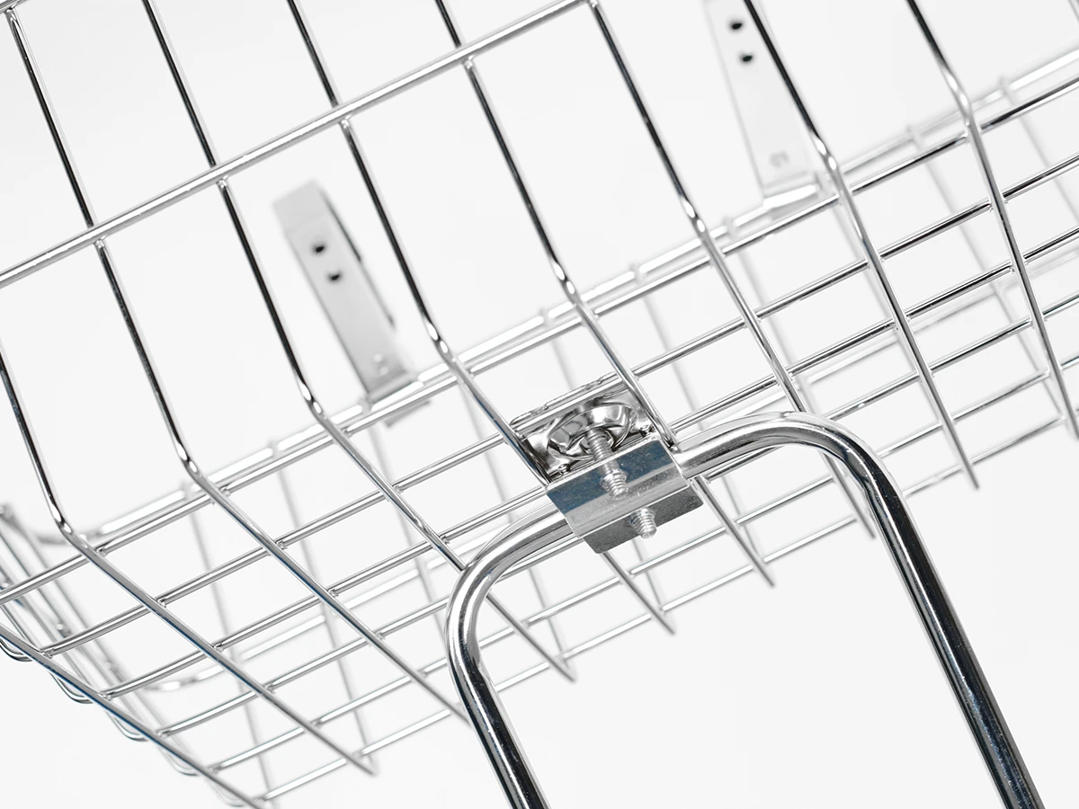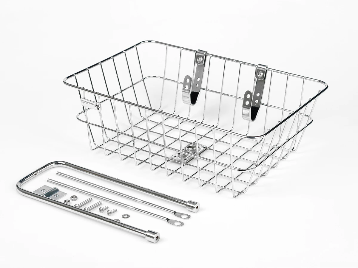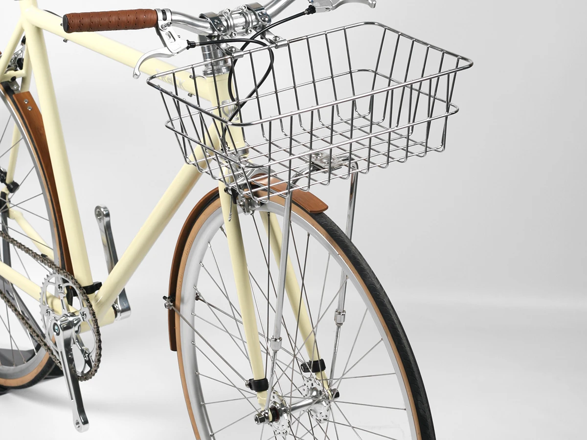 A finely welded chromed mesh basket, supplied with a slim and elegant front wheel stand. Chromed handle bar supports will fit a wide range of bars and clamp sizes from 22.2mm – 26.0mm and can even fit 31.8 bars that taper down to 26mm. Stand can be adjusted to fit a range of wheel and bike sizes from 26” up 700c and 27” 1/1/4.