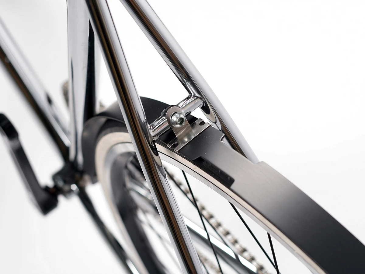 They are supplied with an adjustable clip-on system to fit any bike frame, and unique CNC’d brake cut outs to fit slim brake clearances and frames without mudguard drillings.