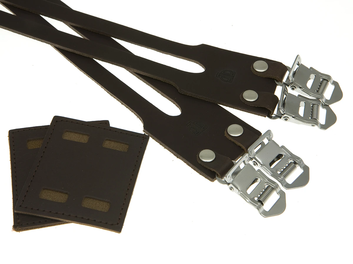 The BLB Double leather toe straps (dark brown) are for double gate toe clips. The double leather straps are supplied with a special leather binding patch, which enables double straps to keep their shape whilst securing a stronger hold on the foot.