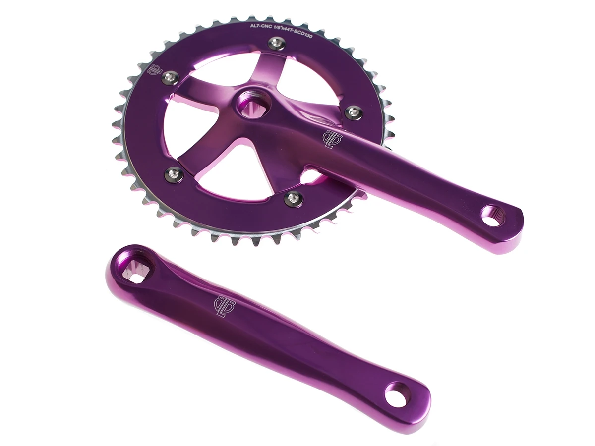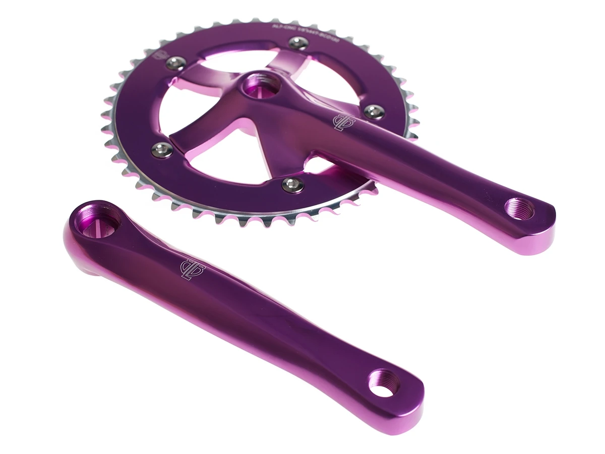The BLB Freestyle Crankset (purple) is super tough and made for freestyle riders, with extra rigidity and strength.