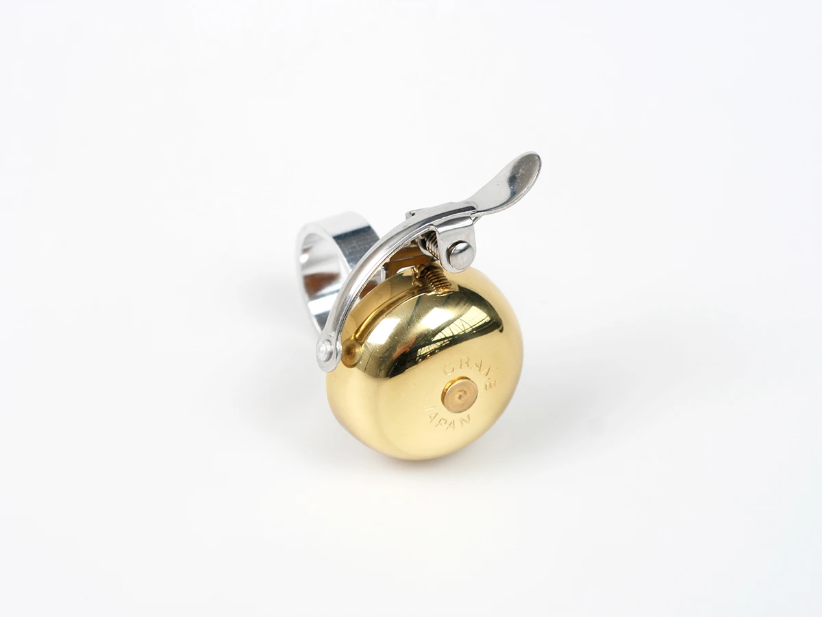 Crane bells are made in Osaka, Japan. This traditional design (brass) is timeless and has beautiful clear ring tones. This is the small size bell from Crane, designed to fit any steerer tube, that is plenty loud – 50% louder than the little brass bells that aren’t quite loud enough, and louder even than your typical “ding-ding” bells. Every bike should have one.