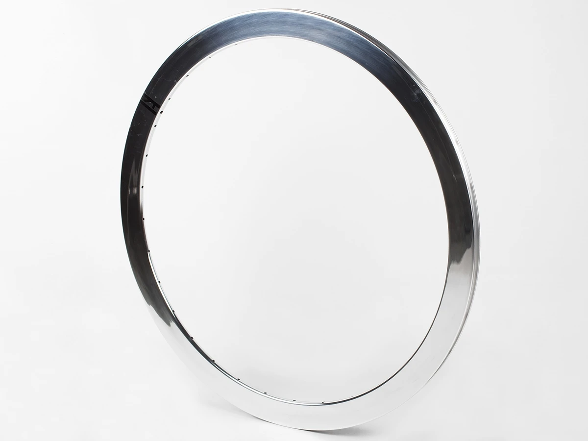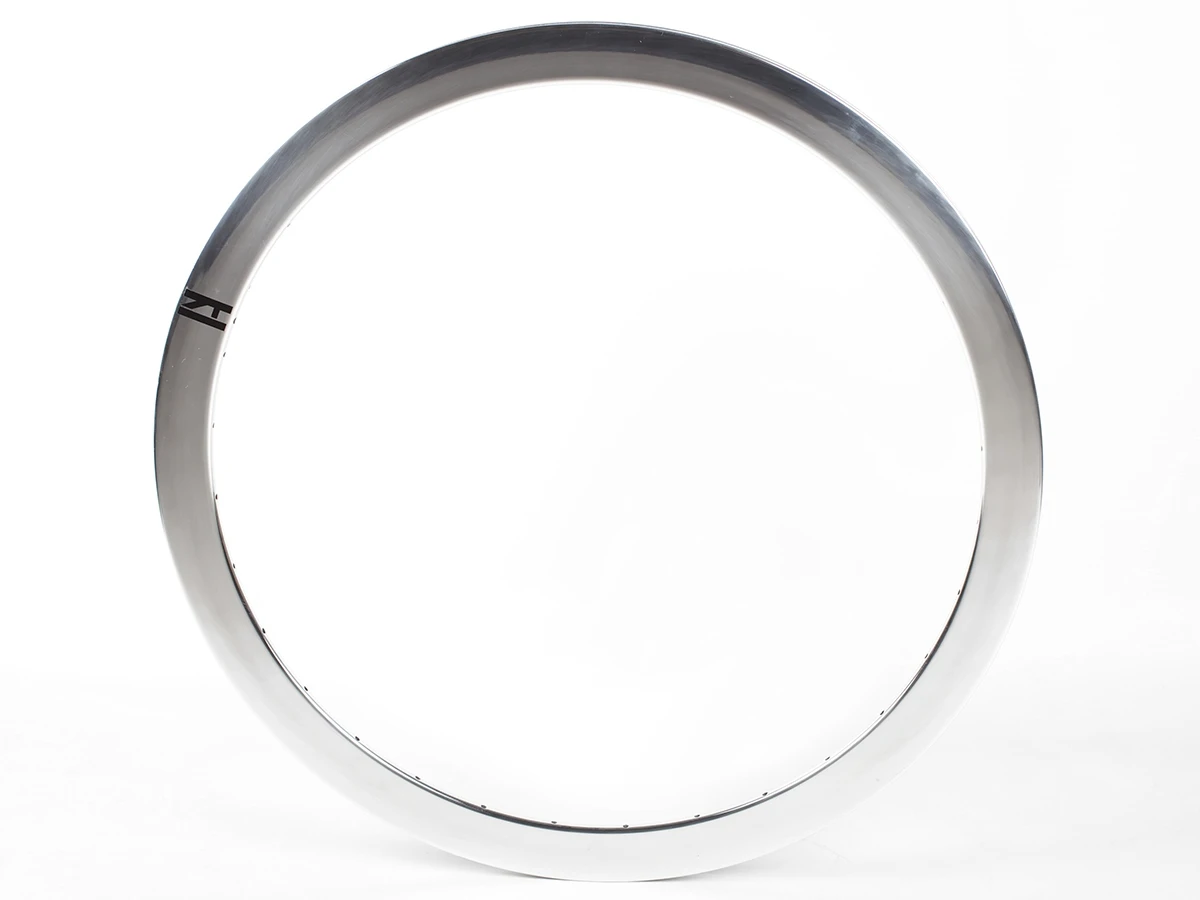 The H+Son Formation Face 700c (polished nmsw) is a true “V” profile rim. Without any stress points in the sidewall, the uniform triangle shape improves the rim’s lateral stiffness. The simple profile shape also saves weight by reducing the distance between the bead hook and the spoke bed.