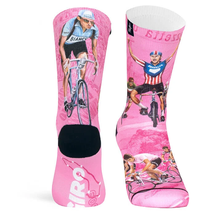 We would like to pay tribute again to the world of professional cycling. It is now up to Gran Tours: as a tribute to the 3 big races of the history of cycling: La Vuelta, Le Tour and El Giro. In Giro 1909 socks we stand out the historical cyclist Fausto Coppi also known as Il Campionissimo and five-times champion of this race. He is considered as one of the best cyclist of the history. He definitely deserved a tribute! In the front side of the socks, Roger De Vlaeminck called “El Gitano” with his cycling costume of Brooklyn and on the squad we can find Eddy Merckx. Illustrated by Jota Erre
