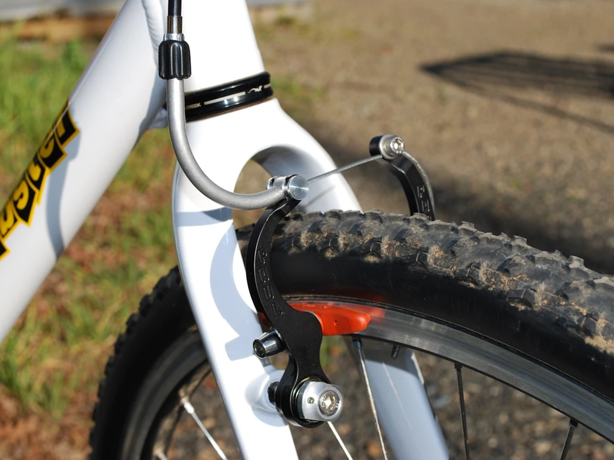 With a simple pivoting quick release on one arm, it’s easy to open the brake to remove a wheel. The cable enters the brake through a barrel adjuster at the top of the curved cable noodle. This adjuster makes it quick and painless to fine-tune the cable tension of the brake without tools.